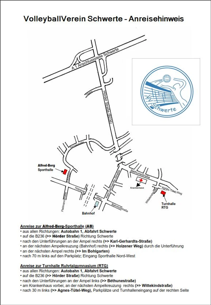 Über die A1/A45 — Ausfahrt Schwerte. Folgen Sie der Beschilderung Richtung Schwerte-Mitte. Die Sporthalle befindet sich Im Bohlgarten 12.